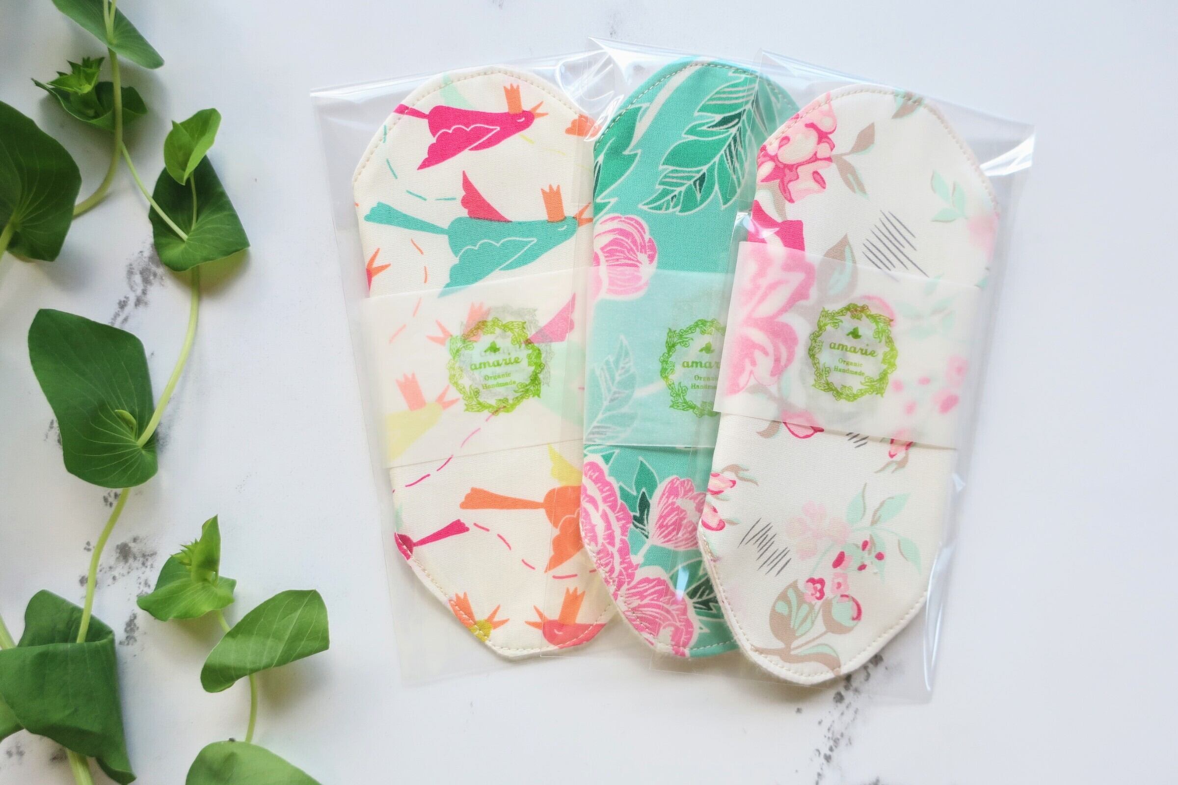 布ライナーは、華やかなデザインのプレミアムコットンとオーガニックフランネルの2枚構造です。薄いので、乾きやすく氣軽にお使いいただけます。