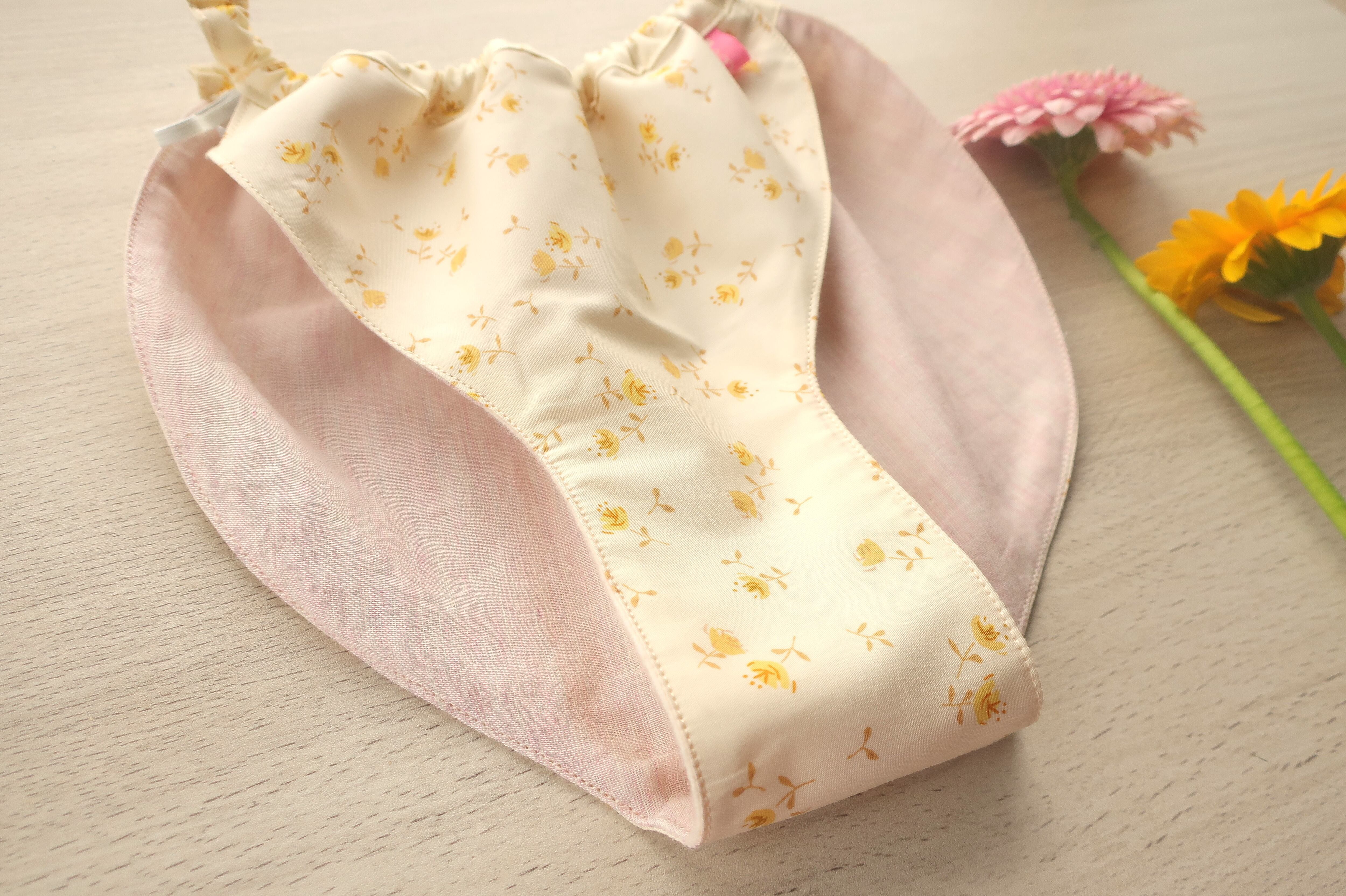 うっかり漏れても大丈夫なように、布ナプキンと同じオーガニックコットンフランネルを股の部分に使用しています。